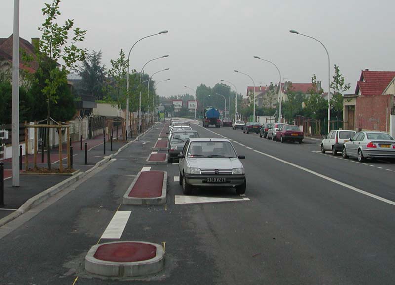 La piste cyclable est large, bien protégée par des îlots surélevés qui séparent les zones de stationnement des voitures.