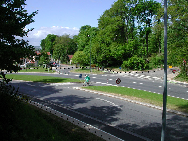 Tenter de faire passer les cyclistes par un trajet long et difficile alors qu'ils peuvent emprunter (illégalement) un trajet court est une erreur de conception fréquente. Il est possible d'avoir une attitude rigide et légaliste en affirmant qu'ils peuvent respecter les règles, mais ce n'est pas une attitude pragmatique de décideur responsable de la sécurité. Sur cette jonction d'une route de la forêt de Marly et d'une voie départementale contournant Saint Nom la Bretèche (PC9E) le trajet réglementaire est indiqué par un tracé en pointillé. Le cycliste quittant la voie forestière de la forêt et qui veut poursuivre sa promenade sur les voies interdites à la circulation des voitures va devoir rejoindre sur la piste qui est au premier plan de la photo pour suivre pendant une centaine de mètres le CD. Le parcours "normal", indiqué par les ronds noirs sur la photo, consiste à tourner à droite pour prendre la piste cyclable en descendant, puis à croiser la route qui entre dans Saint Nom la Bretèche, à continuer sur la piste descendante pour croiser le CD à un feu qui est au delà des limites de la photo sur la gauche, pour enfin remonter le long de ce CD. La quasi totalité des cyclistes utilisent un trajet court, comme le fait le cycliste au maillot vert photographié, prenant en sens interdit la voie qui est réservée aux véhicules effectuant un tourne à gauche pour redescendre vers l'entrée de Saint Nom la Bretèche. L'erreur de conception ne se limite pas en fait aux trajets des cyclistes, c'est l'ensemble du dessin de ce carrefour qui est absurde. Alors qu'il y avait toute la place pour faire un rond point, les concepteurs de cette déviation ont fait un carrefour complexe avec un feu totalement inutile permettant des usages abusifs des trajectoires possibles. Par exemple les automobilistes venant de la droite de la photo et qui voient le feu passer au rouge vont obliquer brutalement vers leur droite comme s'ils allaient entrer dans Saint Nom, puis retourner vers leur gauche pour tourner à droite au feu qui est alors au vert pour les automobilistes qui sortent de Saint Nom !